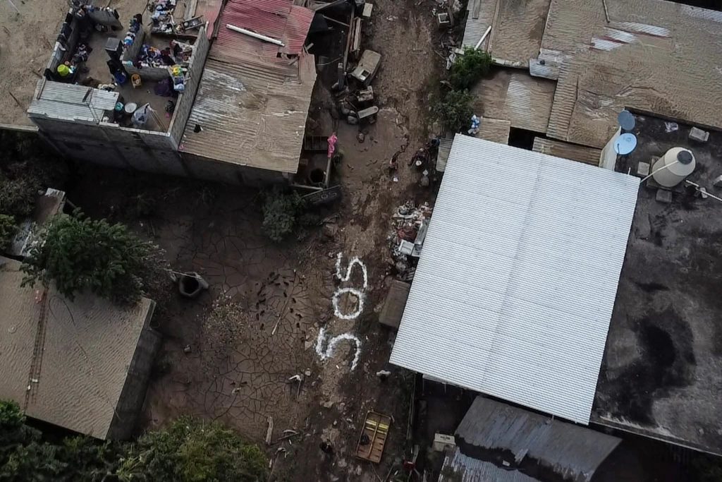 Una imagen aérea muestra a habitantes de Poza Rica caminando entre el lodo y la devastación, junto a un enorme “SOS” trazado en cal.