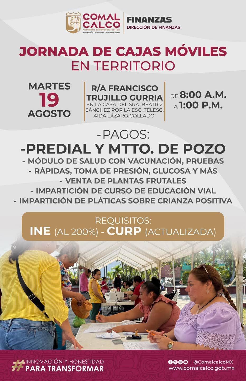 El Ayuntamiento Constitucional de Comalcalco mantiene en marcha las Jornadas de Cajas Móviles en Territorio, con el objetivo de acercar servicios y facilitar a la ciudadanía el pago de predial y mantenimiento de pozo.