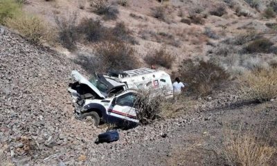 Mandadero, Baja California.– Un camión de valores de SEPSA sufrió una aparatosa volcadura sobre la carretera transpeninsular, a la altura del km 121, en la peligrosa cuesta El Tiburón, al sur de la Heroica Mulegé.