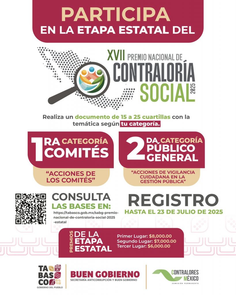 Las inscripciones, para participar en la etapa estatal estarán abiertas hasta el 23 de julio del 2025 y los trabajos serán recibidos en la Secretaría Anticorrupción y Buen Gobierno, ubicadas en el Centro Administrativo y, de igual manera, a través de correo electrónico.
