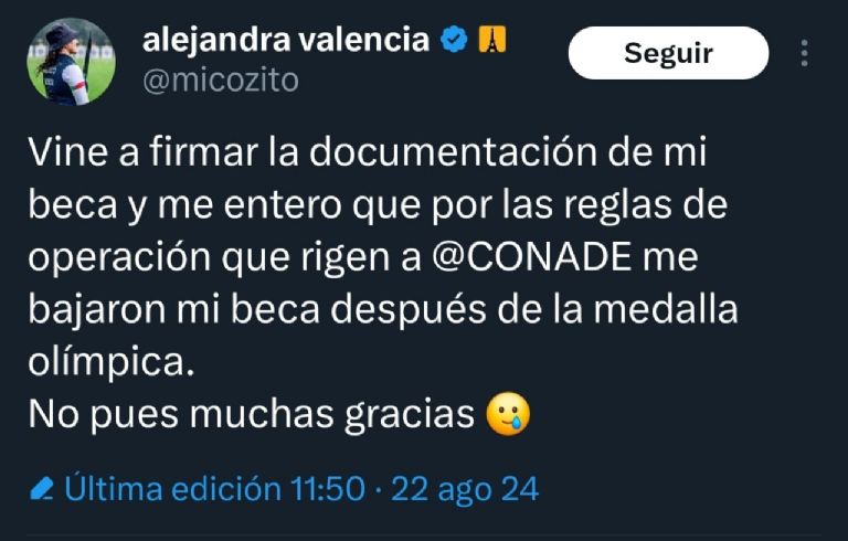 La medallista de bronce en los Juegos Olímpicos de París 2024, Alejandra Valencia, expresó su sorpresa y descontento al descubrir que su beca otorgada por la Comisión Nacional de Cultura Física y Deporte (Conade) había sido reducida tras su destacada participación. Valencia, quien obtuvo el tercer lugar en la modalidad de tiro con arco en equipo, denunció la situación a través de sus redes sociales, aclarando que no fue notificada previamente sobre la disminución en el monto de su apoyo.