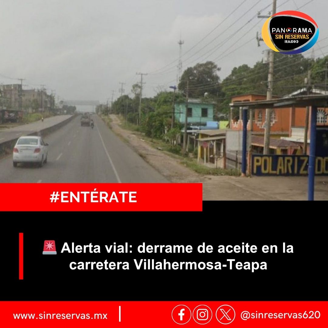 Autoridades del municipio de Teapa emitieron esta mañana una alerta vial tras detectarse un derrame de aceite sobre el pavimento en el kilómetro 45 de la carretera Villahermosa-Teapa, situación que representa un riesgo para peatones y conductores.