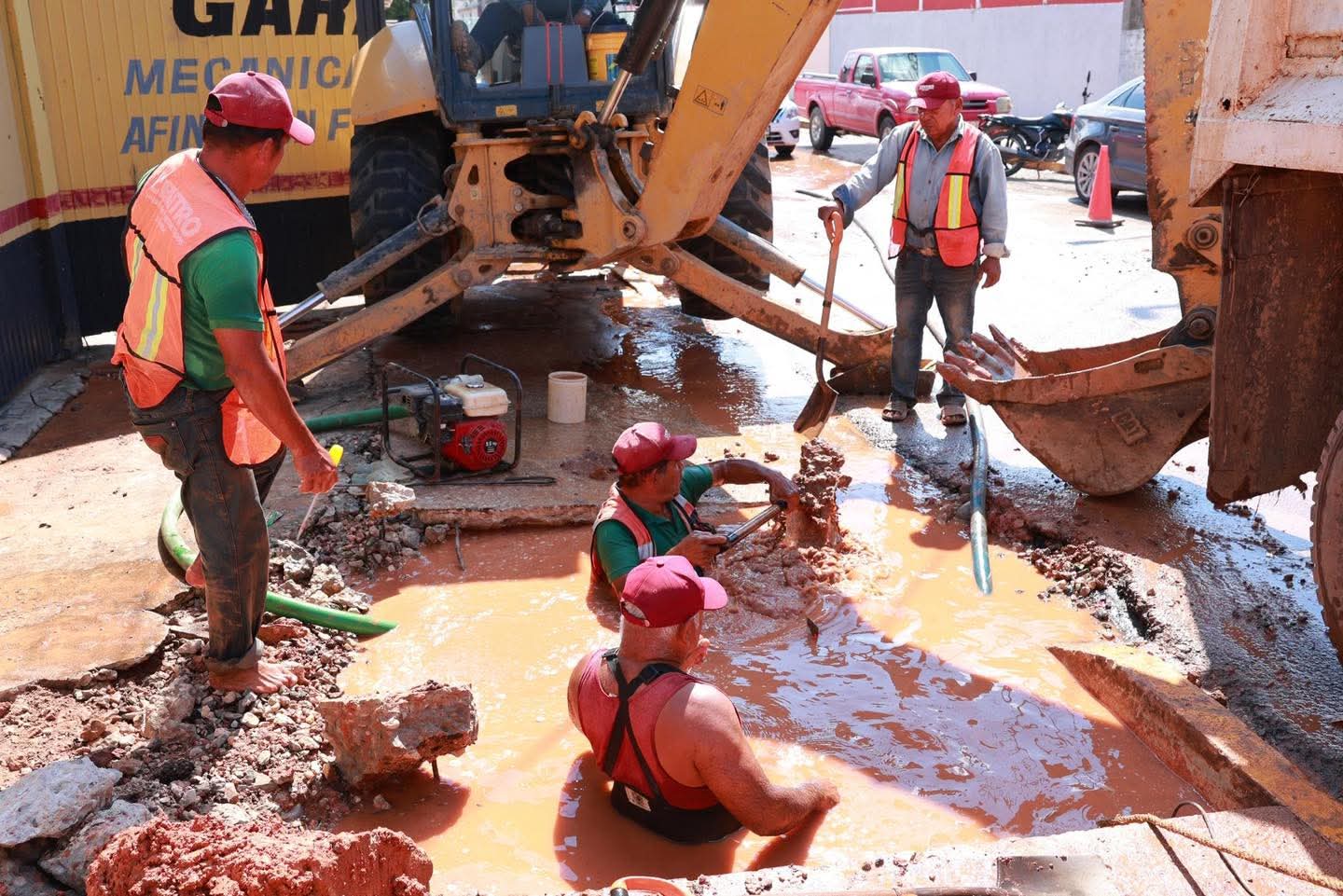El personal operativo del Sistema de Agua y Saneamiento (SAS) Centro lleva a cabo trabajos de reparación de una fuga de agua detectada en una tubería de 6 pulgadas de diámetro, ubicada en la calle Noé de la Flor, casi esquina con Revolución, en la colonia 18 de Marzo.