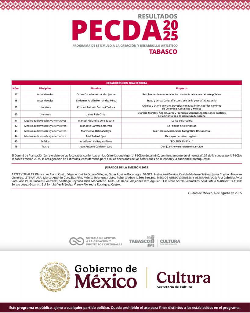 Los resultados completos ya pueden consultarse a través de las redes sociales oficiales de la Secretaría de Cultura de Tabasco, donde se encuentra disponible la lista de las y los seleccionados.