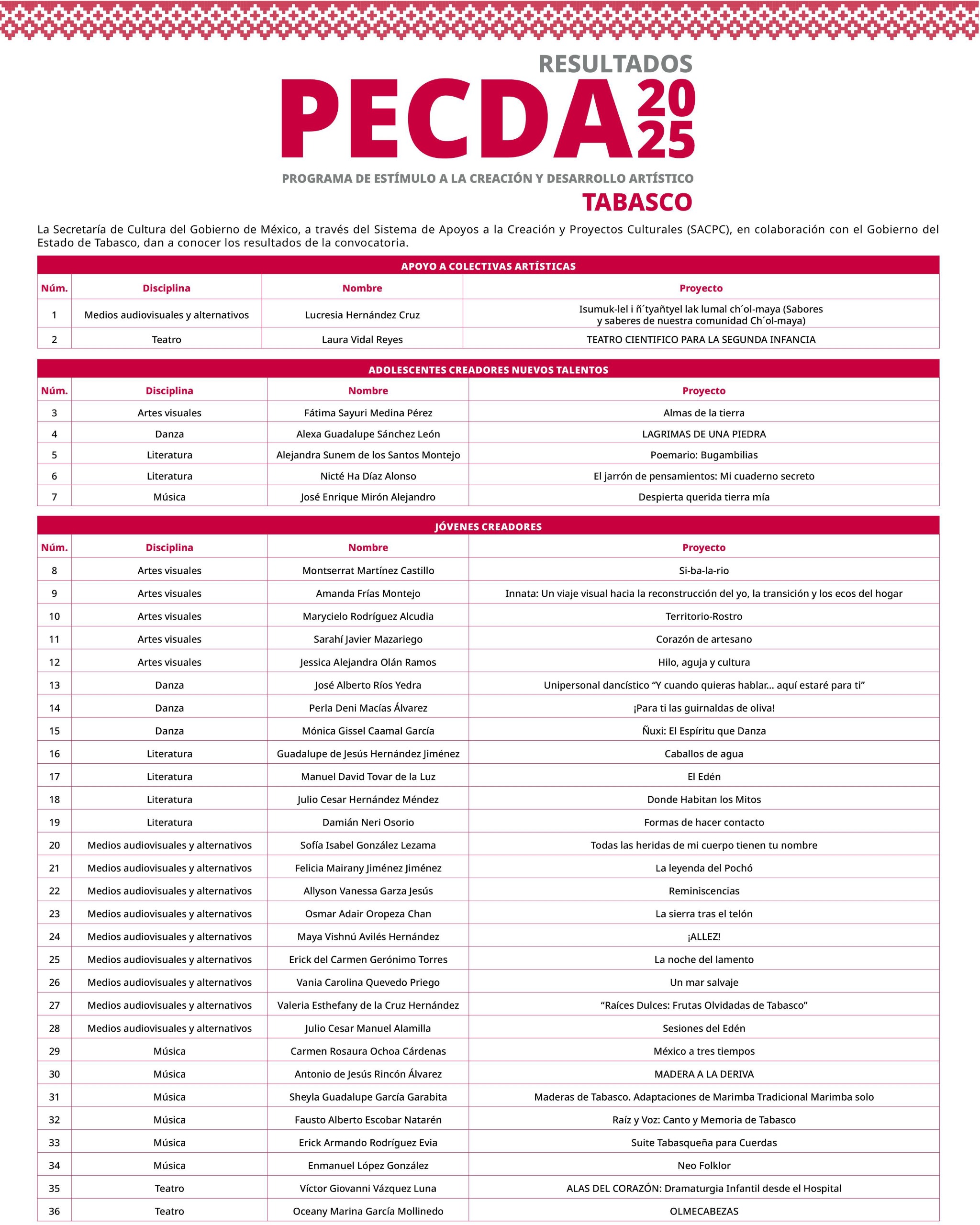 La Secretaría de Cultura de Tabasco dio a conocer los resultados del Programa de Estímulo a la Creación y Desarrollo Artístico (PECDA) 2025, en el cual fueron seleccionados 46 proyectos por parte de la Secretaría de Cultura Federal.
