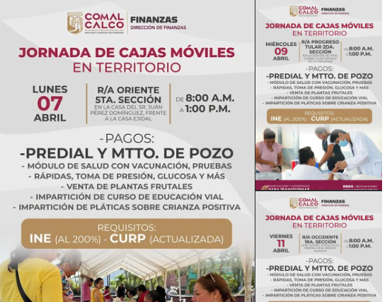 Compartimos las comunidades donde se llevarán a cabo las Jornadas de Cajas Móviles en Territorio de esta semana, acercando las cajas receptoras hasta la ciudadanía para efectuar sus pagos de predial y mantenimiento de pozo, así como un módulo de salud con diversos servicios, venta de plantas frutales, impartición del curso de educación vial y del curso sobre crianza positiva.