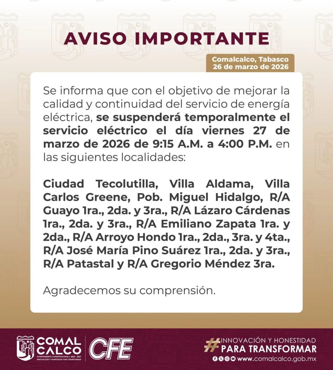 El Ayuntamiento Constitucional de Comalcalco, en coordinación con la Comisión Federal de Electricidad (CFE), informó sobre la suspensión temporal del servicio eléctrico programada para el viernes 27 de marzo de 2026.