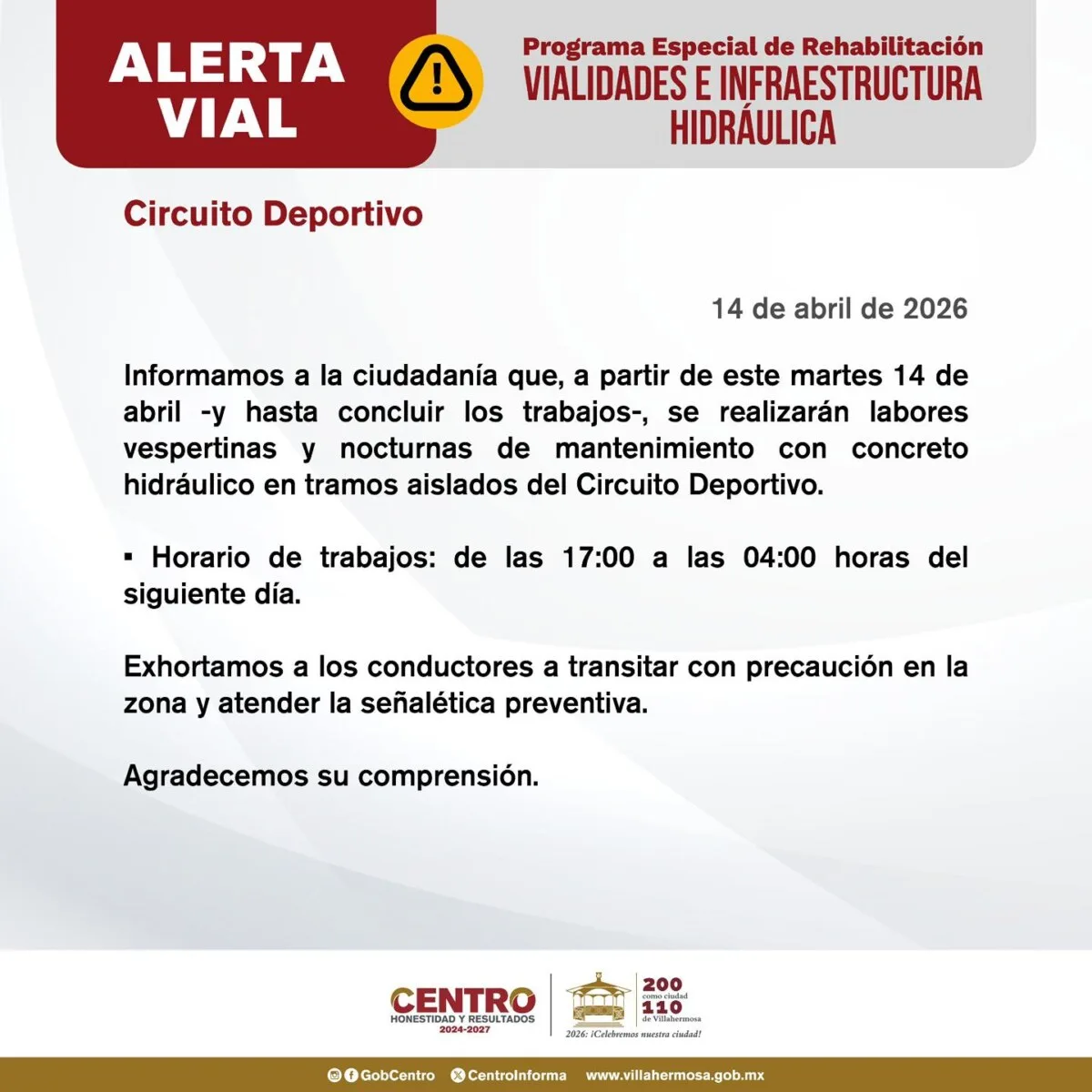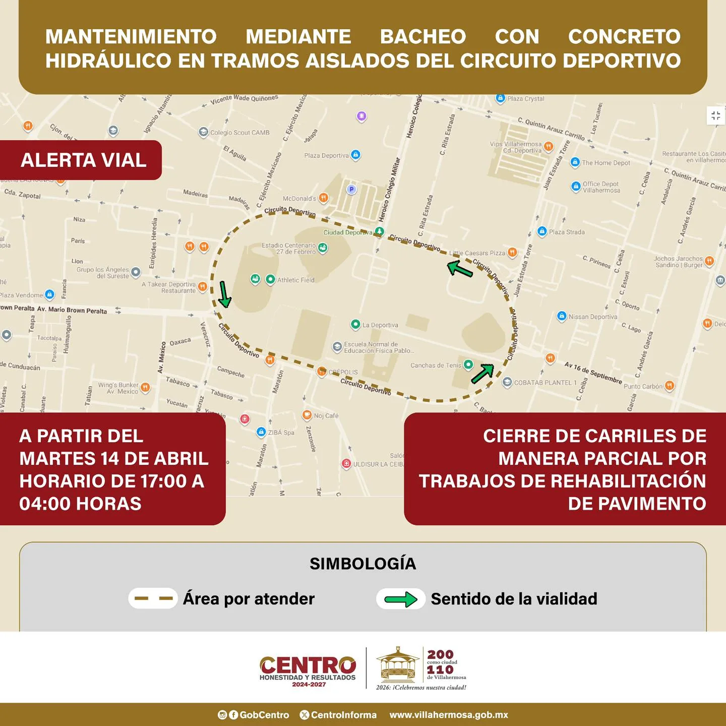 El Ayuntamiento de Centro informó que, a partir del martes 14 de abril y hasta la conclusión de los trabajos, se llevarán a cabo labores de mantenimiento hidráulico en tramos aislados del Circuito Deportivo.