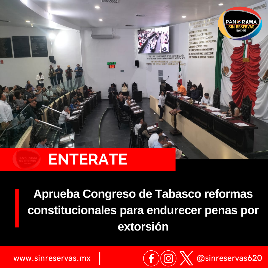 El Congreso de Tabasco aprobó reformas a la Constitución Política del estado en materia de extorsión, con el objetivo de aumentar las penas para este delito y armonizar la legislación local con la Ley Federal.
