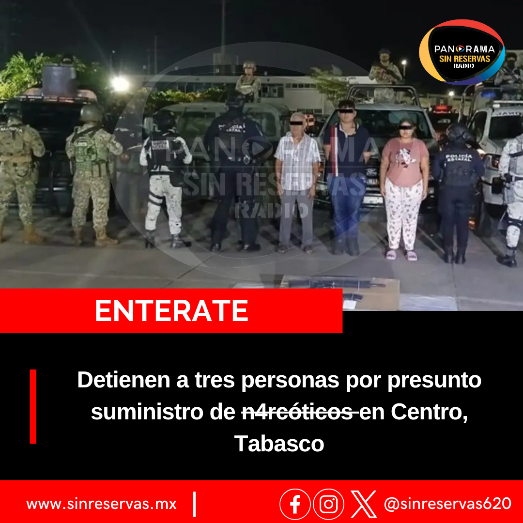 Como resultado de las estrategias de seguridad implementadas en Centro, Tabasco, la Secretaría de Seguridad y Protección Ciudadana (SSPC), en coordinación con la Fuerza Interinstitucional de Reacción Táctica (FIRT) Olmeca, detuvo a tres personas por el presunto delito de suministro de narcóticos.