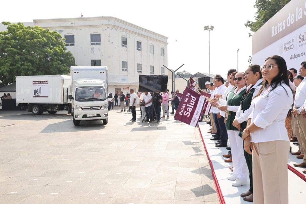 El Gobernador Javier May Rodríguez, en presencia vía online de la Presidenta Claudia Sheinbaum Pardo, dio el banderazo de salida a 28 vehículos que forman parte de las ‘Rutas de la Salud’, una estrategia federal implementada por el IMSS-Bienestar que permitirá distribuir más de un millón 90 mil medicamentos a 503 unidades médicas en los 17 municipios y consolidar el sistema de salud en el estado.