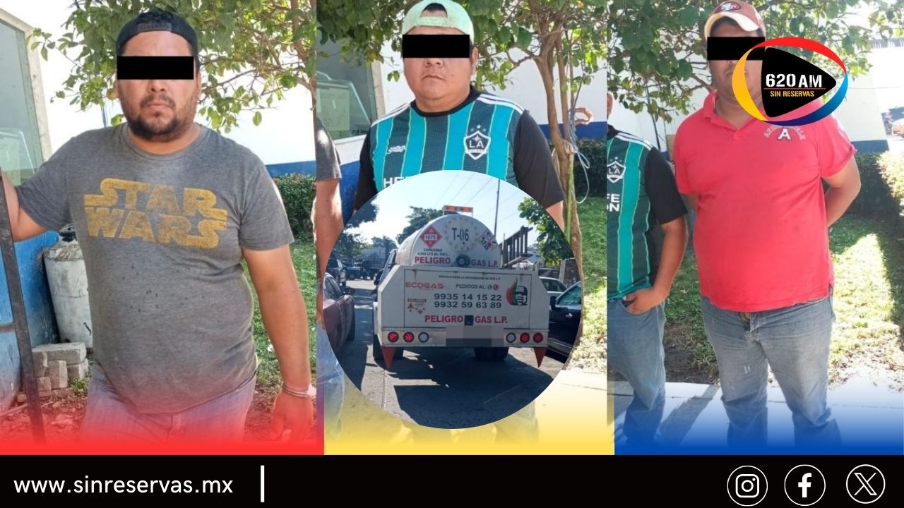 Centro, Tabasco.— Tres personas fueron detenidas durante un operativo de seguridad realizado sobre la carretera principal de la ranchería Ixtacomitán Primera Sección, en el municipio de Centro, luego de ser sorprendidas transportando gas LP sin acreditar su legal procedencia.