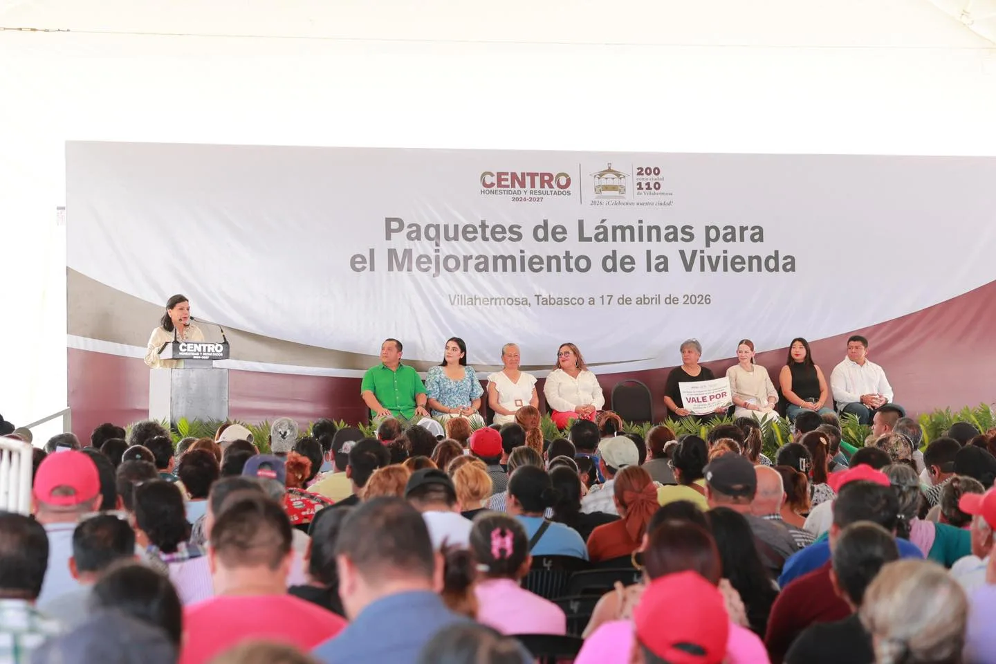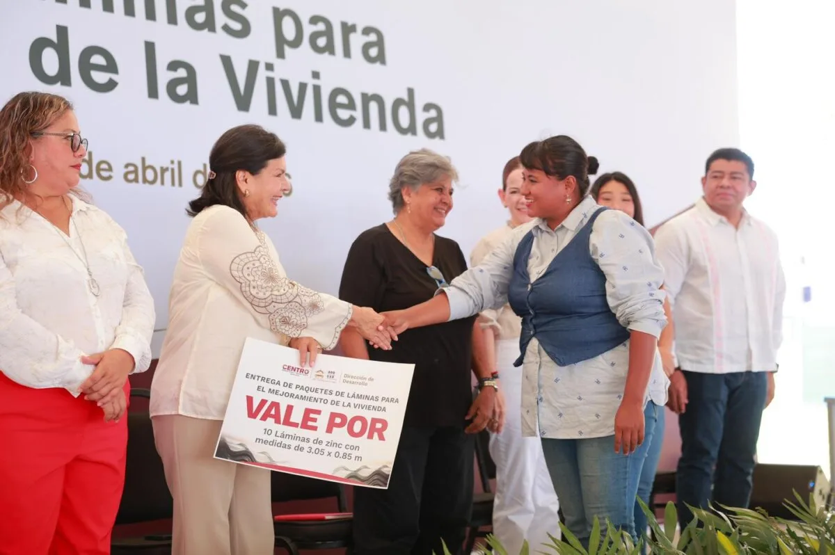 La alcaldesa de Centro, Yolanda Osuna Huerta, encabezó la entrega de mil 300 paquetes de láminas en el fraccionamiento Lagunas, con una inversión de 3.3 millones de pesos, como parte de las acciones para mejorar las condiciones de vivienda de las familias.