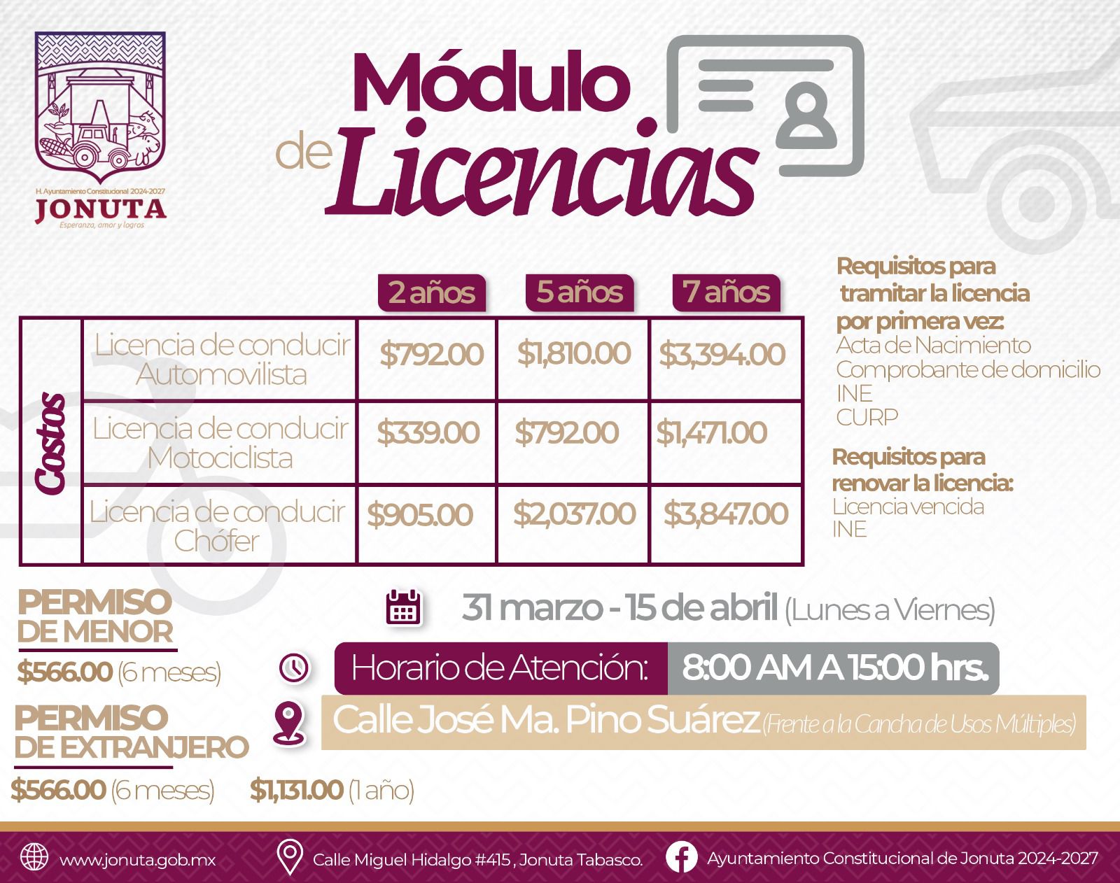 El Ayuntamiento de Jonuta, encabezado por la Mtra. María Soledad Villamayor Notario, informa que del 31 de marzo al 15 de abril estará disponible el Módulo Móvil de Expedición de Licencias en las oficinas de Tránsito Municipal, ubicadas frente a la Cancha de Usos Múltiples.