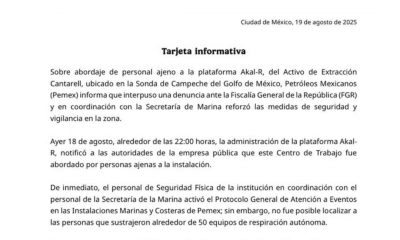 Petróleos Mexicanos (Pemex) informó sobre un incidente ocurrido en la plataforma Akal-R, perteneciente al Activo de Extracción Cantarell, ubicada en la Sonda de Campeche del Golfo...