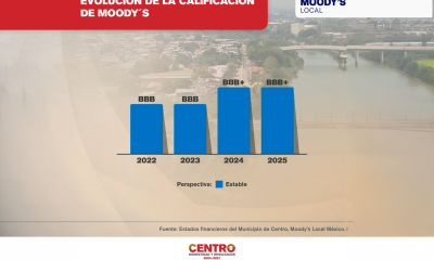 La agencia calificadora Moody’s Investors Service ratificó la mejora en la calificación crediticia del municipio de Centro en BBB+ con perspectiva estable, reconociendo la solidez de...