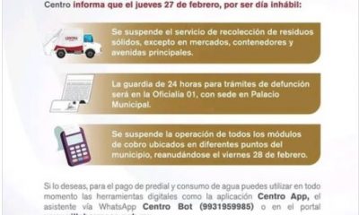 El Gobierno Municipal de Centro informó que el jueves 27 de febrero será considerado día inhábil en conmemoración del triunfo de las fuerzas liberales sobre los...