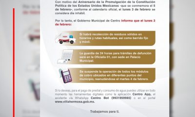 El Gobierno Municipal de Centro informa que el lunes 3 de febrero: 4o