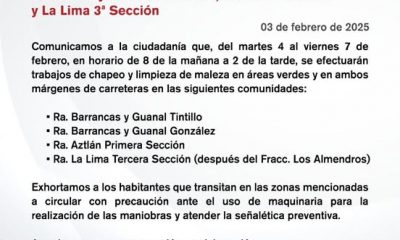 La alcaldesa de Centro, Yolanda Osuna Huerta, informa que a partir del martes 4 de febrero se llevarán a cabo trabajos de chapeo y limpieza de...