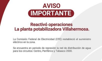 El Sistema de Agua y Saneamiento (SAS) Centro anunció que las operaciones de la planta potabilizadora Villahermosa se han reactivado con normalidad. Se invita a la...