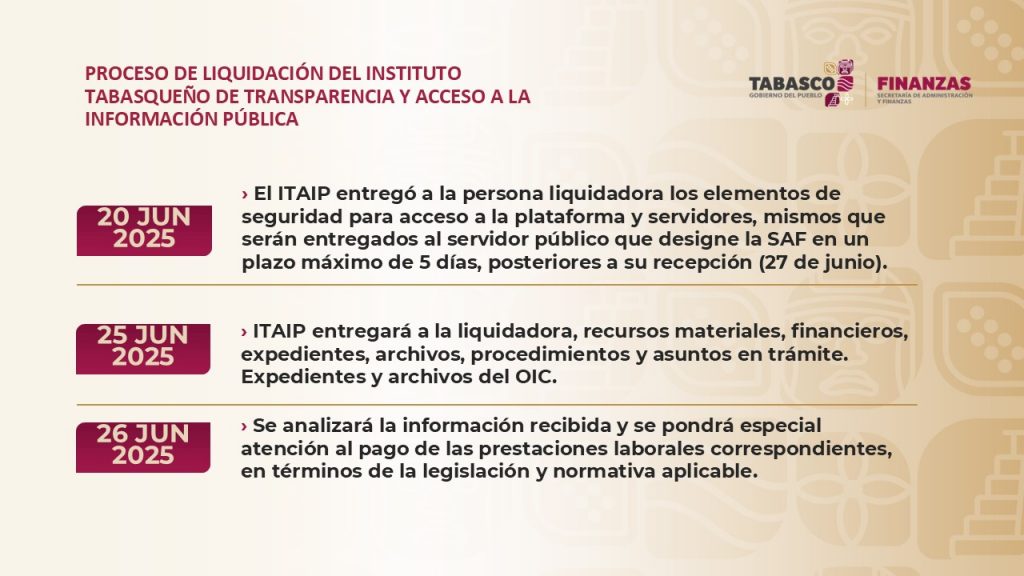 El proceso de extinción del Instituto Tabasqueño de Transparencia y Acceso a la Información Pública (ITAIP) y del Sistema Estatal Anticorrupción del Estado de Tabasco (SESEA) se desarrollará de manera ordenada, transparente y documentada, aseguró la titular de la Oficialía Mayor del Gobierno del Estado, Vania Elizabeth de Alba González, al dar a conocer que fue designada para actuar en calidad de persona liquidadora de ambos organismos.