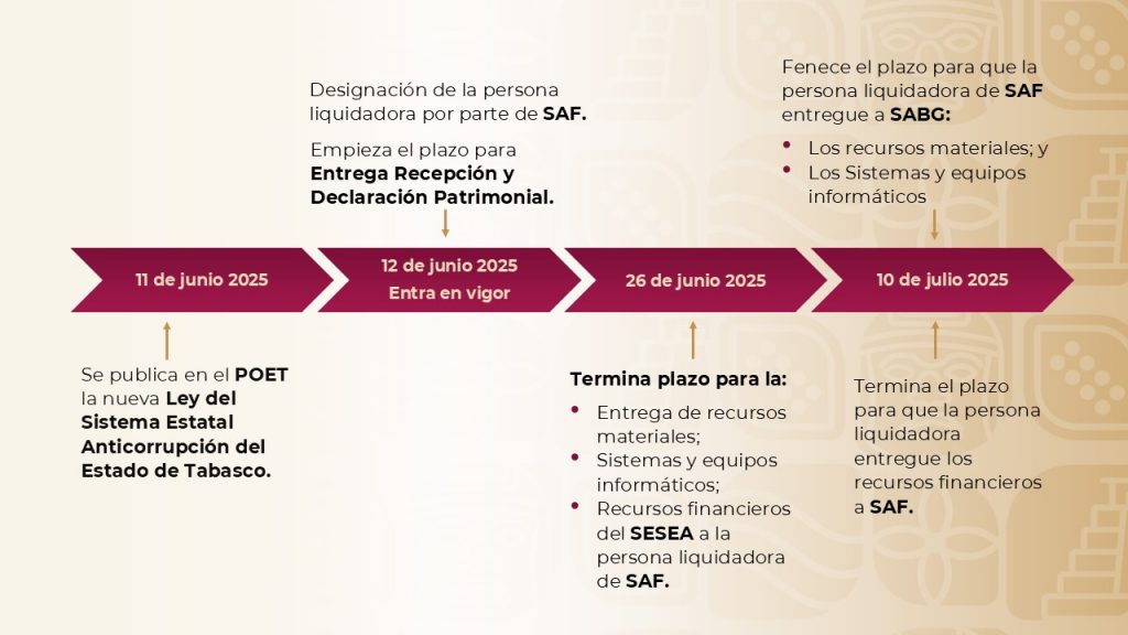 Respecto al proceso de liquidación del SESEA, Vania Elizabeth de Alba González, refirió que éste dio inicio el pasado día 11 de junio por medio de la publicación que se hizo de la nueva Ley del Sistema Estatal Anticorrupción del Estado de Tabasco, y el 12 de junio fue designada como persona liquidadora por parte de la SAF.