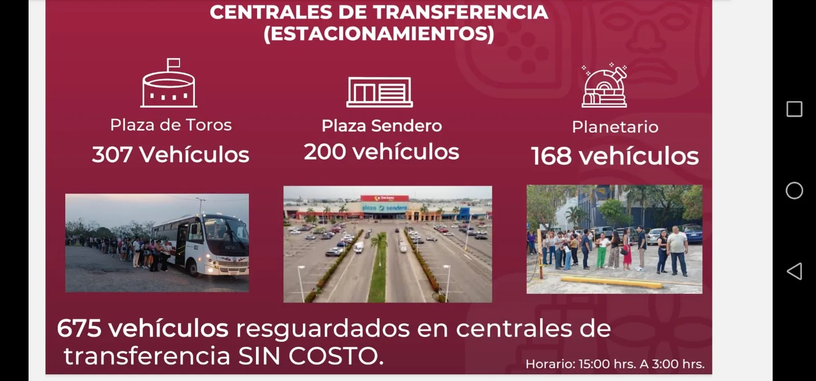 - El titular del ramo, Rafael Elías Sánchez Cabrales informó que centrales de transferencia en Plaza de Toros, Planetario, Galerías Tabasco 2000 y Plaza Sendero cuentan con capacidad de estacionamiento gratis para 700 unidades