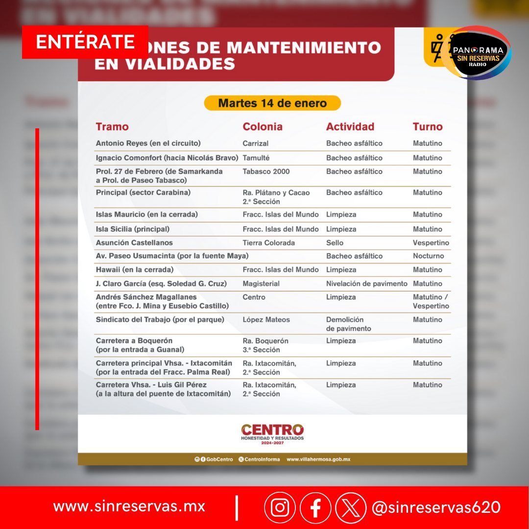 Ayuntamiento de Centro da a conocer las acciones de mantenimiento vial programadas para hoy
