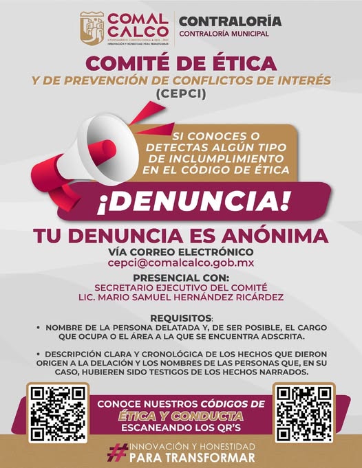 El Ayuntamiento Constitucional de Comalcalco pone a disposición de la ciudadanía y de su personal el Comité de Ética, como un mecanismo para reportar cualquier irregularidad o incumplimiento al Código de Ética vigente para el periodo 2024-2027.