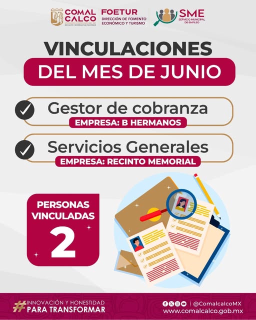 El Ayuntamiento Constitucional de Comalcalco, a través de la Dirección de Fomento Económico y Turismo y el Servicio Municipal de Empleo, informó que como resultado de su más reciente Jornada de Reclutamiento, se logró vincular exitosamente a dos personas con vacantes disponibles en empresas de la región.