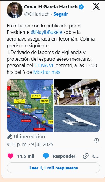 Por su parte, García Harfuch respondió también por X, detallando que la aeronave fue detectada a 200 km al sur de San Salvador como parte de labores de vigilancia del espacio aéreo mexicano. Reiteró el respeto del Gobierno de México hacia el pueblo salvadoreño.