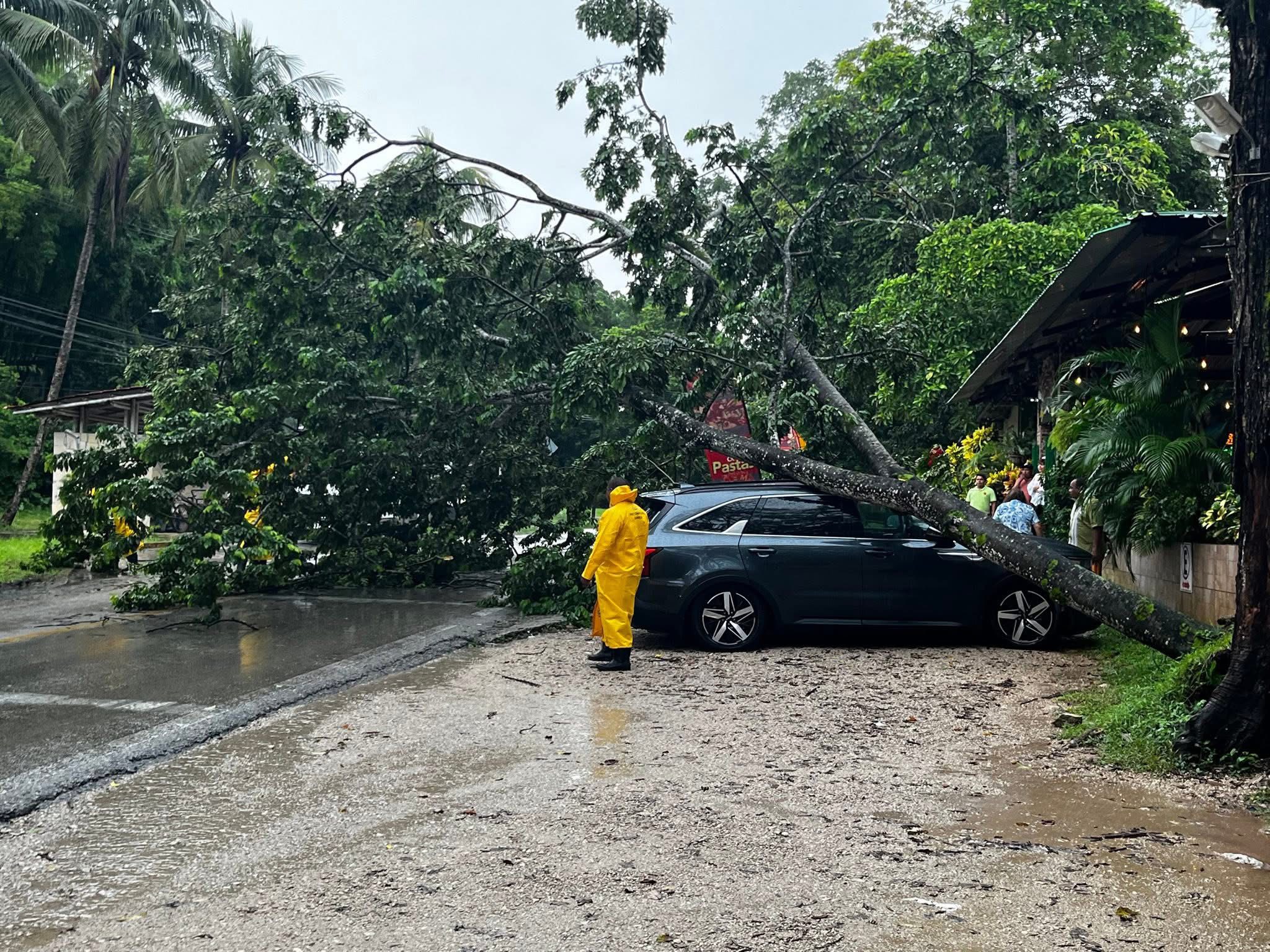 Las lluvias registradas esta tarde provocaron que un árbol cayera sobre la carretera que conecta Palenque con la Zona Arqueológica, debido al reblandecimiento del suelo.