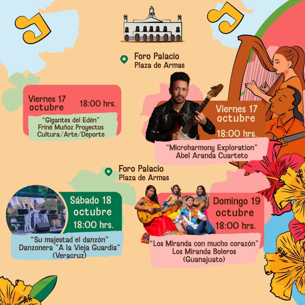 En la emblemática Plaza de Armas Los Miranda Boleros se presentarán con el concierto “Los Miranda con mucho corazón”; y el Taller de Teatro Campesino e Indígena ofrecerá el espectáculo “Poesía dramatizada de Carlos Pellicer Cámara”.