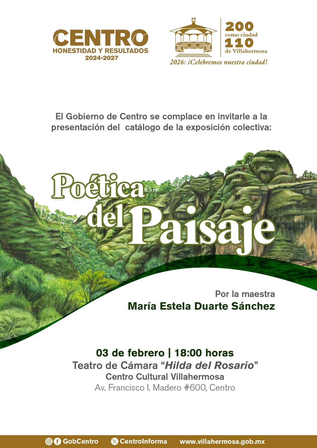 El Centro Cultural Villahermosa invita a la presentación del catálogo de la Exposición Colectiva La Poética del Paisaje, una muestra que reúne obras de destacados artistas como José María Velasco, Tina Modotti, Dr. Atl, Luis Covarrubias, Ezequiel Negrete, Miguel Ángel Gómez Ventura, Félix Parra y Carlos Pellicer López, entre otros referentes del arte nacional.