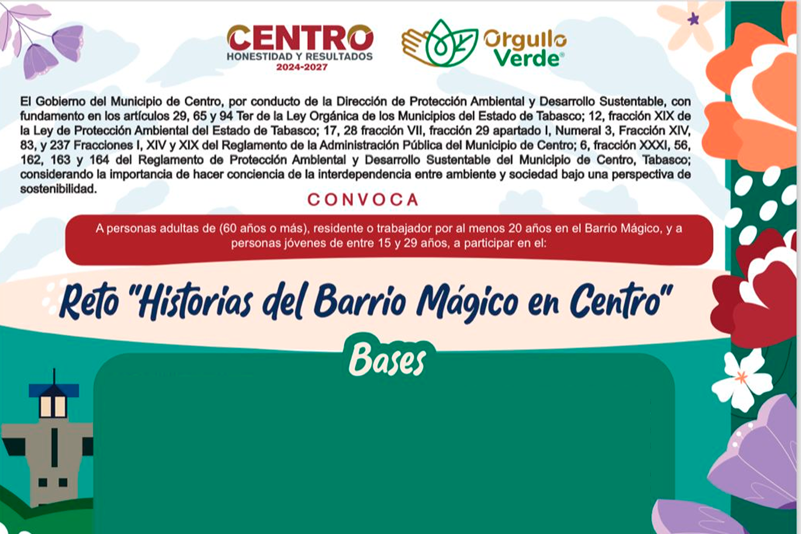 El Gobierno de Centro convoca al Reto “Historias del Barrio Mágico en Centro”, una oportunidad para compartir vivencias y recuerdos sobre la naturaleza, calles, edificios, costumbres y comercios del Barrio Mágico Zona Luz de Villahermosa, a través de un video. La fecha límite para enviar las propuestas es el 24 de agosto.