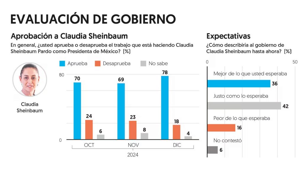 La presidenta Claudia Sheinbaum alcanza este jueves sus primeros 100 días al frente del Poder Ejecutivo federal, respaldada por un nivel de aprobación ciudadana del 78% en diciembre, según datos de la serie de encuestas nacionales de El Financiero. Este porcentaje representa el nivel de apoyo más alto registrado durante su mandato, superando el 70% de octubre y el 69% de noviembre.