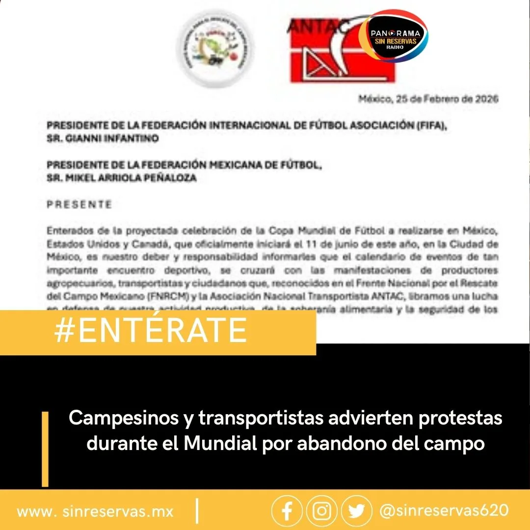 Productores campesinos y transportistas advirtieron a la Federación Mexicana de Fútbol y a la FIFA que realizarán protestas y posibles bloqueos durante la celebración del próximo Copa Mundial de la FIFA 2026, ante lo que califican como abandono del campo mexicano.