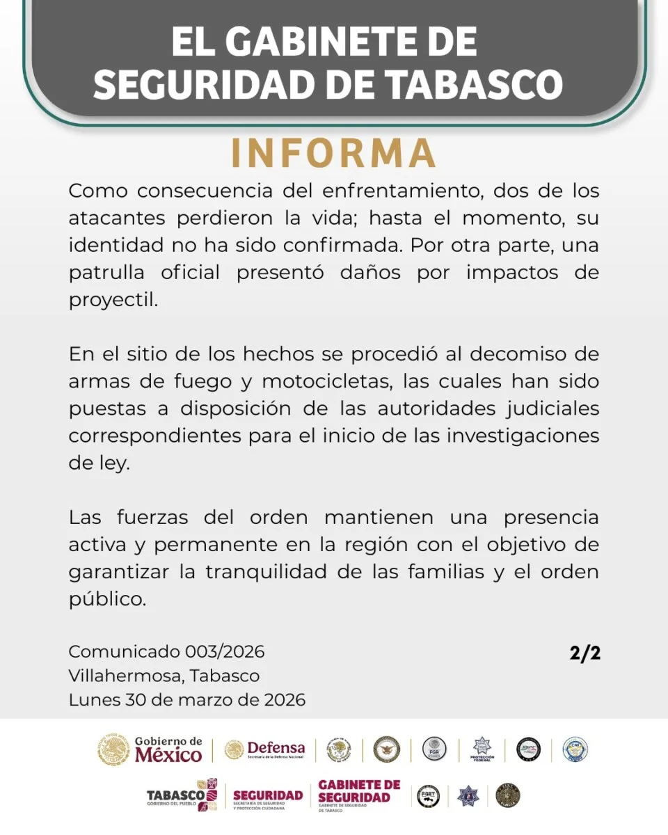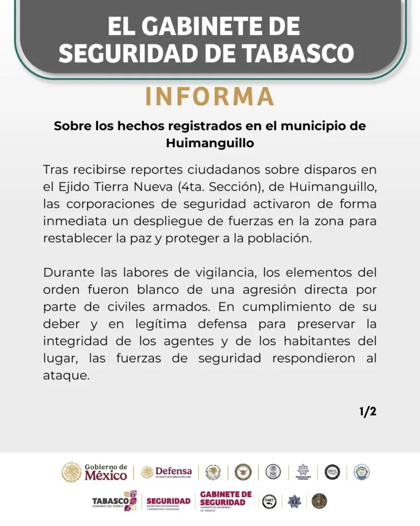 COMUNICADO DEL GABINETE DE SEGURIDAD: Sobre los hechos registrados en el municipio de Huimanguillo