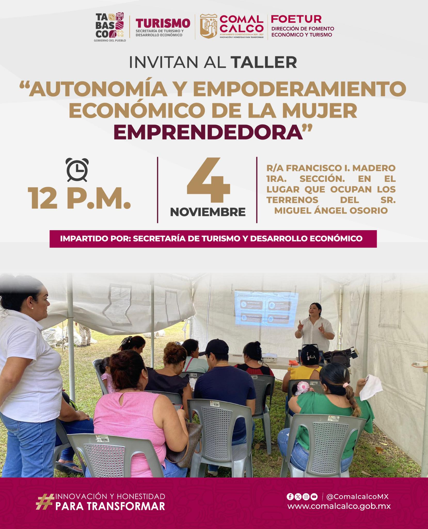 El Ayuntamiento de Comalcalco, a través de la Dirección de Fomento Económico y Turismo, invita al taller “Autonomía y Empoderamiento Económico de la Mujer Emprendedora”.