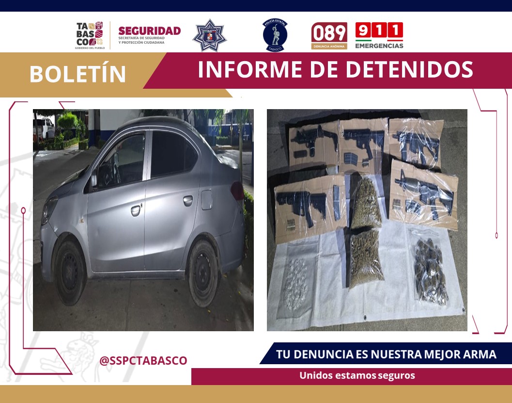 Como resultado de las estrategias de seguridad, la Secretaría de Seguridad y Protección Ciudadana de Tabasco en coordinación con la Fuerza Interinstitucional de Reacción Táctica (FIRT) Olmeca, detuvo a cinco personas por el presunto delito contra la Ley General de salud y portación de arma de fuego.