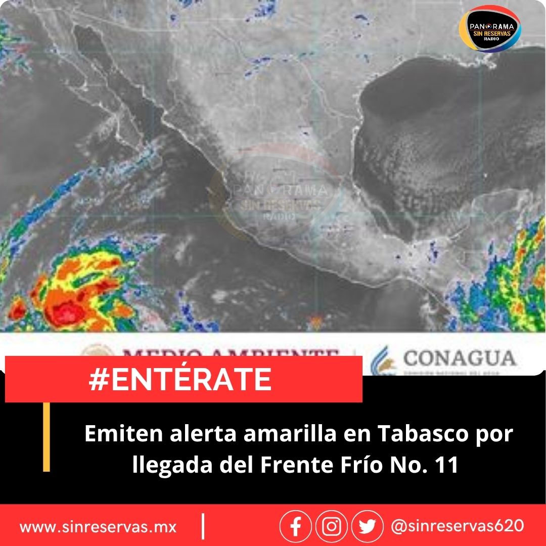 El Instituto de Protección Civil del Estado de Tabasco (IPCET) emitió alerta amarilla ante los efectos del Frente Frío No. 11, que comenzará a impactar a la entidad desde la tarde de este miércoles y hasta la noche del jueves.