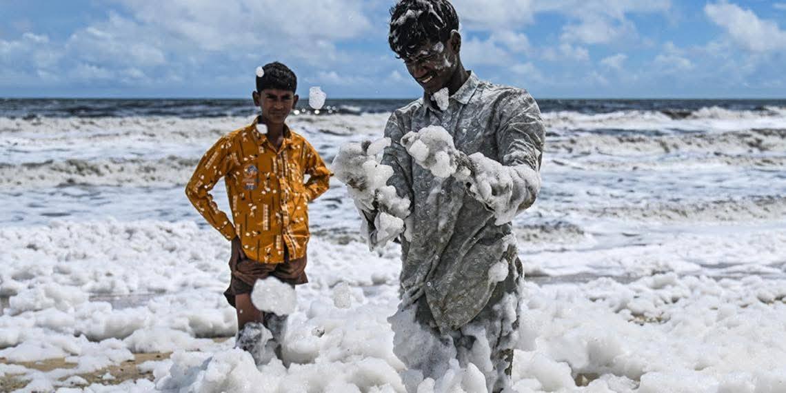 La costa sur de Chennai, India, amaneció cubierta por una espesa capa de espuma blanca que, aunque en apariencia parecía inofensiva, en realidad fue provocada por la contaminación del agua.