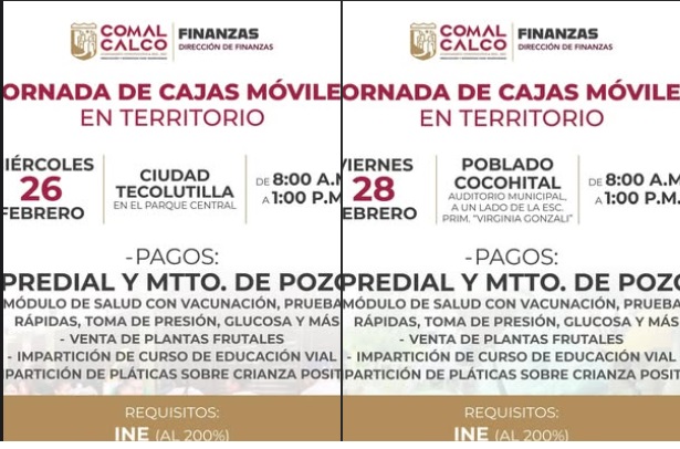 Continuamos con las Jornadas de Cajas Móviles en Territorio de esta semana, acercando las cajas receptoras hasta la ciudadanía para efectuar sus pagos de predial y mantenimiento de pozo, así como un módulo de salud con diversos servicios, venta de plantas frutales, impartición del curso de educación vial y del curso sobre crianza positiva.