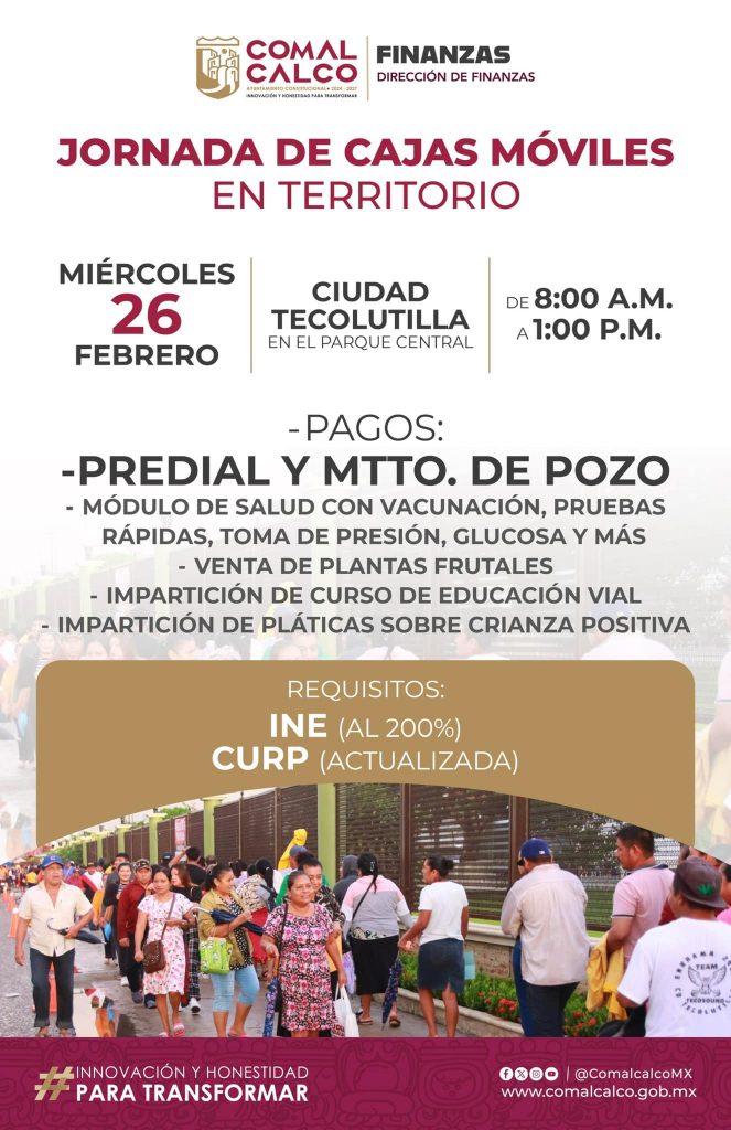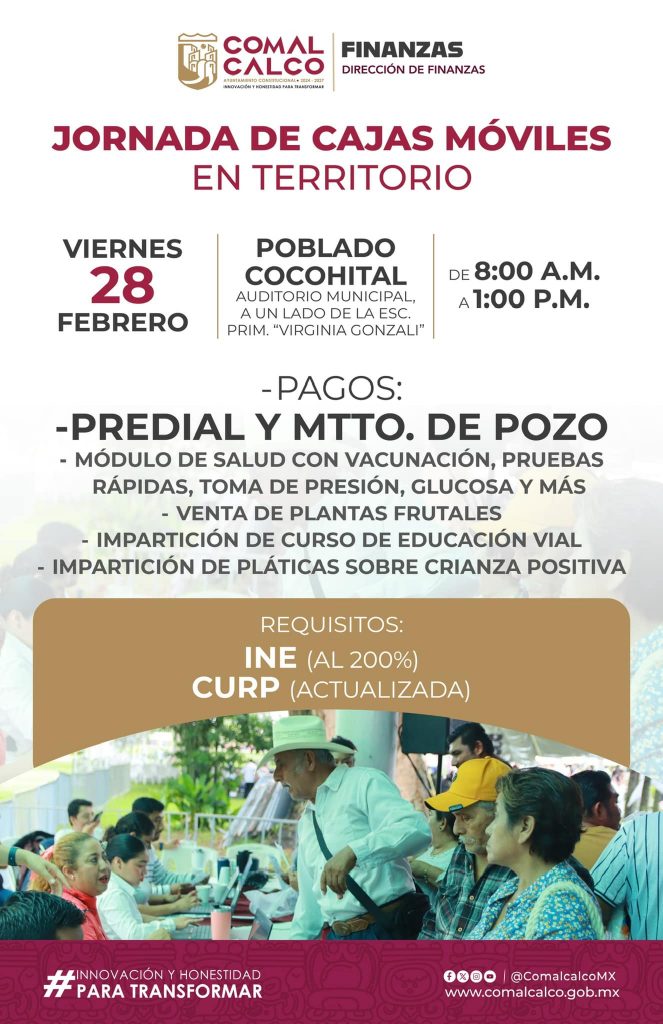 Continuamos con las Jornadas de Cajas Móviles en Territorio de esta semana, acercando las cajas receptoras hasta la ciudadanía para efectuar sus pagos de predial y mantenimiento de pozo, así como un módulo de salud con diversos servicios, venta de plantas frutales, impartición del curso de educación vial y del curso sobre crianza positiva.
