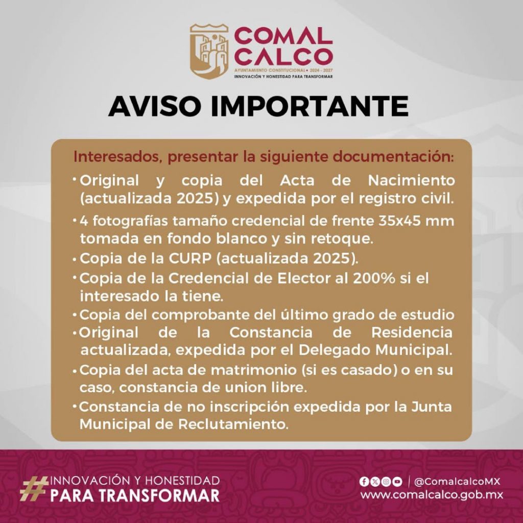 Para más información sobre requisitos y documentación necesaria, se recomienda acudir a las oficinas de la Junta Municipal de Reclutamiento o al propio Ayuntamiento de Comalcalco.