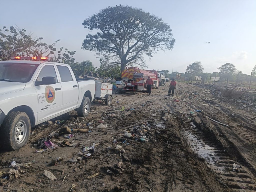 Por tercer día consecutivo, personal del Instituto de Protección Civil del Estado de Tabasco (IPCET), del Centro Regional de Prevención, Atención de Emergencia y Capacitación (CEREPAEC) Costa, Sabana y Bomberos Base Planicie, en coordinación con la Unidad Municipal de Cunduacán, siguen atendiendo el incendio que afecta el basurero municipal ubicado en el Ejido El Mote, de dicha demarcación.