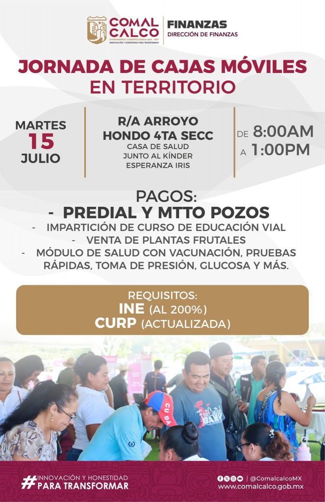 📍 Ranchería Arroyo Hondo, 4ta sección - Miércoles 16 de julio | 8:00 A.M. a 1:00 P.M.