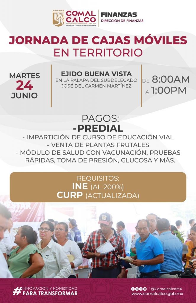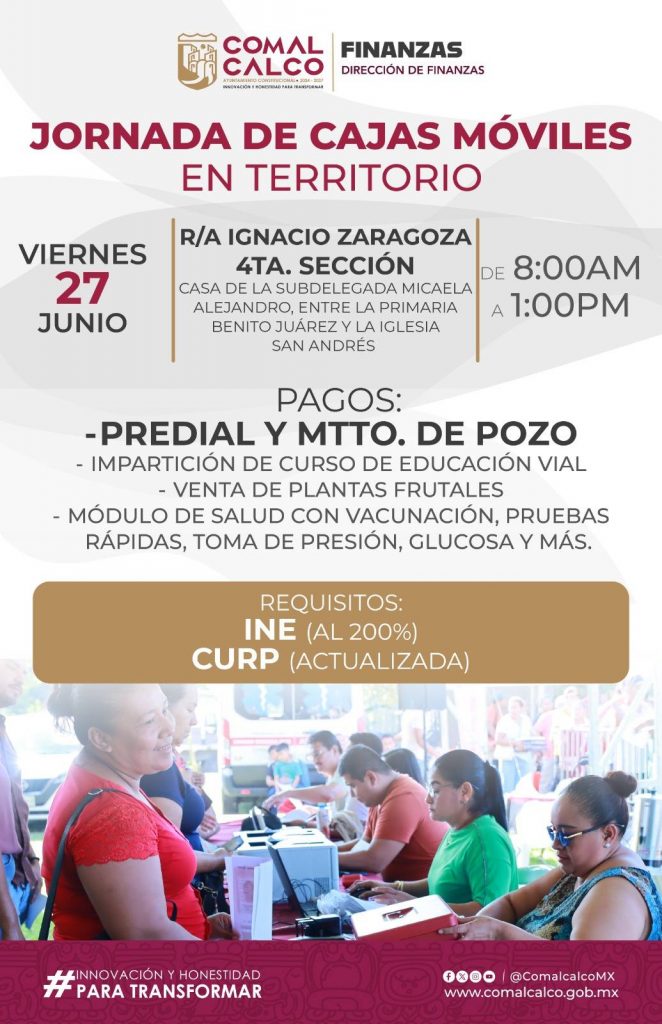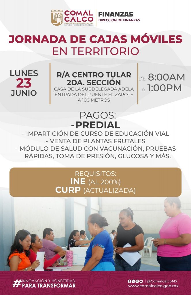 Continúan las Jornadas de Cajas Móviles en Territorio de esta semana, acercando las cajas receptoras hasta la ciudadanía para efectuar sus pagos de predial y mantenimiento de pozo, así como un módulo de salud con diversos servicios, venta de plantas frutales, impartición del curso de educación vial y del curso sobre crianza positiva.