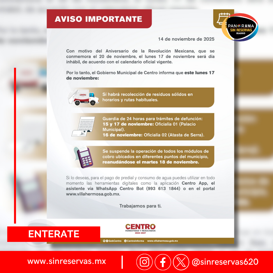 El Ayuntamiento de Centro informó que, con motivo del Aniversario de la Revolución Mexicana —que se conmemora el 20 de noviembre—, el próximo lunes 17 de noviembre será día inhábil conforme al calendario oficial vigente.