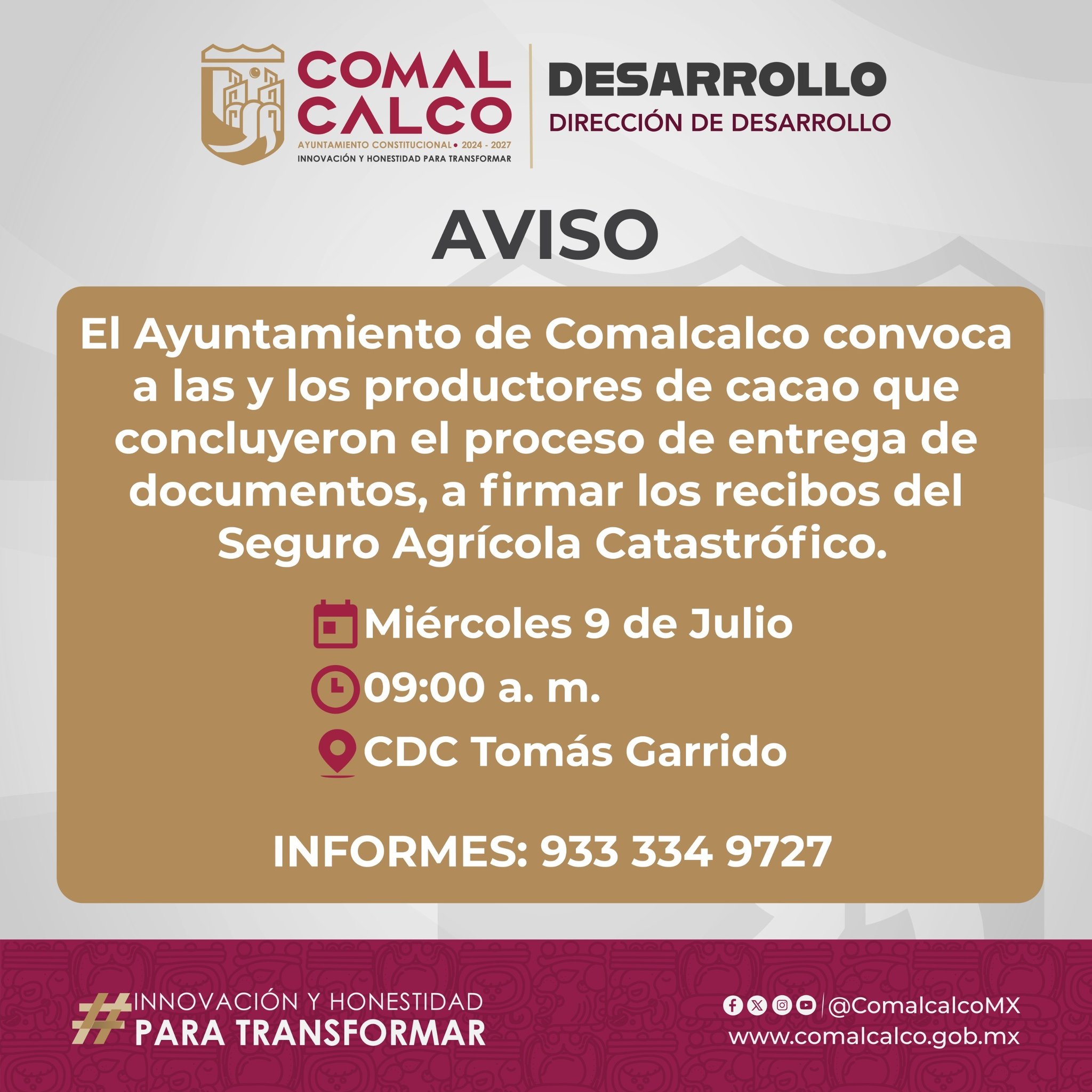 El Ayuntamiento de Comalcalco, a través de la Dirección de Desarrollo, convoca a las y los productores de cacao que concluyeron oportunamente el proceso de entrega de documentación, a presentarse para firmar los recibos correspondientes al Seguro Agrícola Catastrófico.